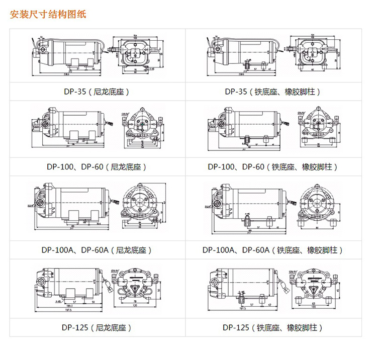 1.微型電動隔膜泵安裝時,需拔出隔膜泵進出口的封蓋.2.裝有隨泵附帶的進出口接頭,DP-130 DP-125 DP-100 DP-60型隔膜泵進出口采用ZG3/8″外牙G29/64″彎管接頭;DP-35隔膜泵進出口采用3/8″外牙軟管接頭.