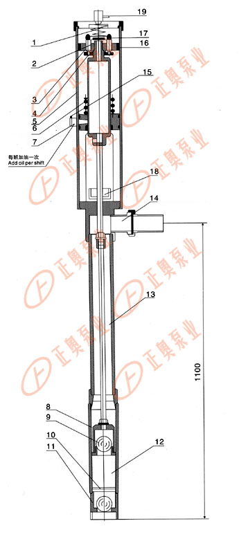 氣動漿料泵產品采用氣壓差的作用,使活塞上下運行,帶動導料活塞開閉,起到提料的作用。 具體裝置如圖(一)所示: 1、缸體 2、進氣閥 3、彈簧 4、彈簧 5、活塞 6、排氣管 7、換氣管 8、密封底座 9、密封上蓋 10、漿料缸體 11、進料口 12、漿料活塞 13、進料鋼球 14、鋼球 15、連桿 16、漿料管 17、出料口 18、加油閥 19、放氣閥