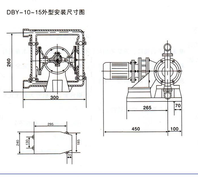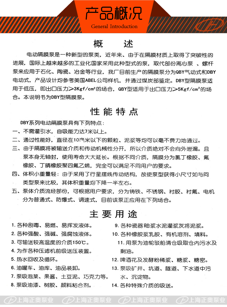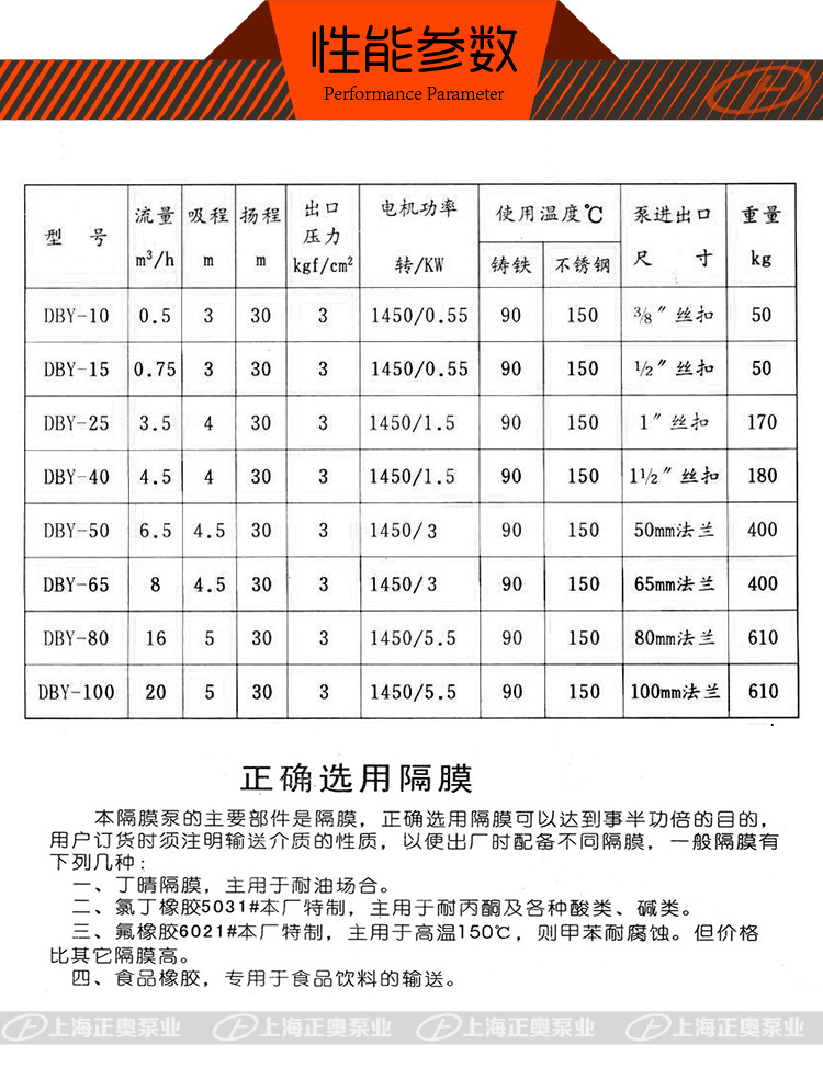 DBY系列電動隔膜泵是一種新型的泵類,近年來,在隔膜材質(zhì)上取得了突破性的進展。本泵應用于石化、陶瓷、冶金等行業(yè),這種泵的主要特點是不需灌引水、自吸能力達7米以上。直徑在10毫米以下的顆粒、泥漿等均可以毫不費力地通過。由于隔膜將被輸送介質(zhì)和傳動機械件分開,所以介質(zhì)不會向外泄漏,且泵本身無軸封,使用壽命大大延長。根據(jù)不同介質(zhì),隔膜分為氯醇橡膠、氟橡膠、丁晴橡膠等,完全可以滿足不同用戶的要求。