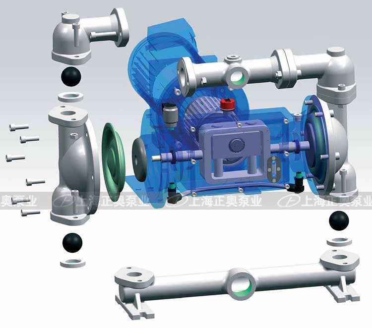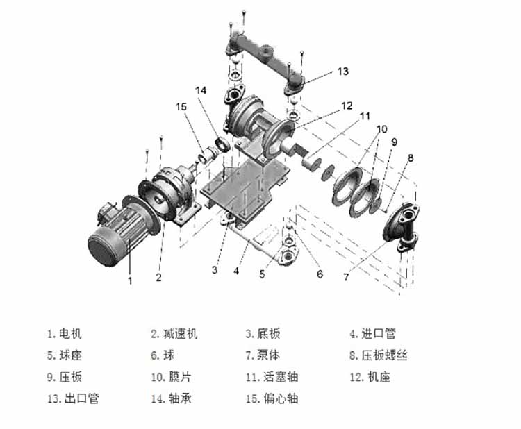 3、由于隔膜將被輸送介質(zhì)和傳動機械件分開,所以介質(zhì)不會向外泄漏;且泵本身無軸封,使用壽命大大延長;根據(jù)不同介質(zhì),隔膜可分為氯丁橡膠、氟橡膠、丁晴橡膠、聚四氟已烯、特氟龍(F46)等,可以滿足不同客戶的要求。