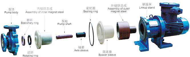 驅動裝置采用主動磁鐵聯軸器直接裝在電機軸上,泵室完全封閉,通過磁力偶合間接驅動泵軸上帶磁鐵的葉輪旋轉結構緊湊。