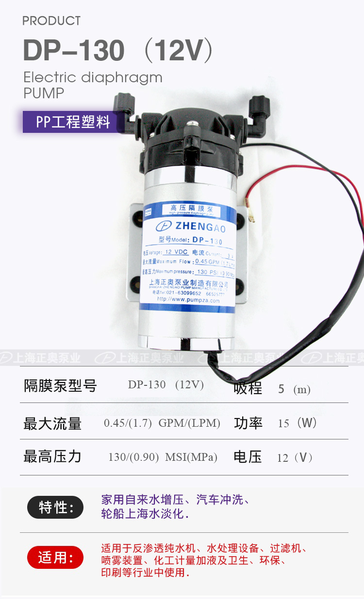 DP微型電動隔膜泵適用于家用自來水增壓、汽車沖洗、輪船上海水淡化,DP隔膜泵適用于反滲透純水機、水處理設備、過濾機、噴霧裝置、化工計量加液及衛生、環保、印刷等行業中使用。