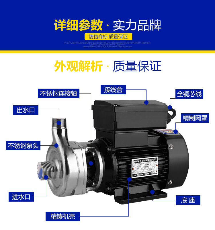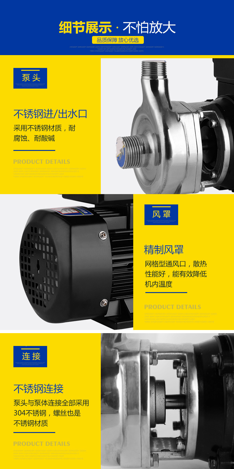不銹鋼離心式耐腐蝕微型電泵可輸送溫度不高于103℃,含有細小軟顆粒或纖維質,帶腐蝕性或有衛生要求的液體,廣泛適用于食品、飲料、醫藥、污水處理、化工、電鍍、漂染、精細化工等行業使用。