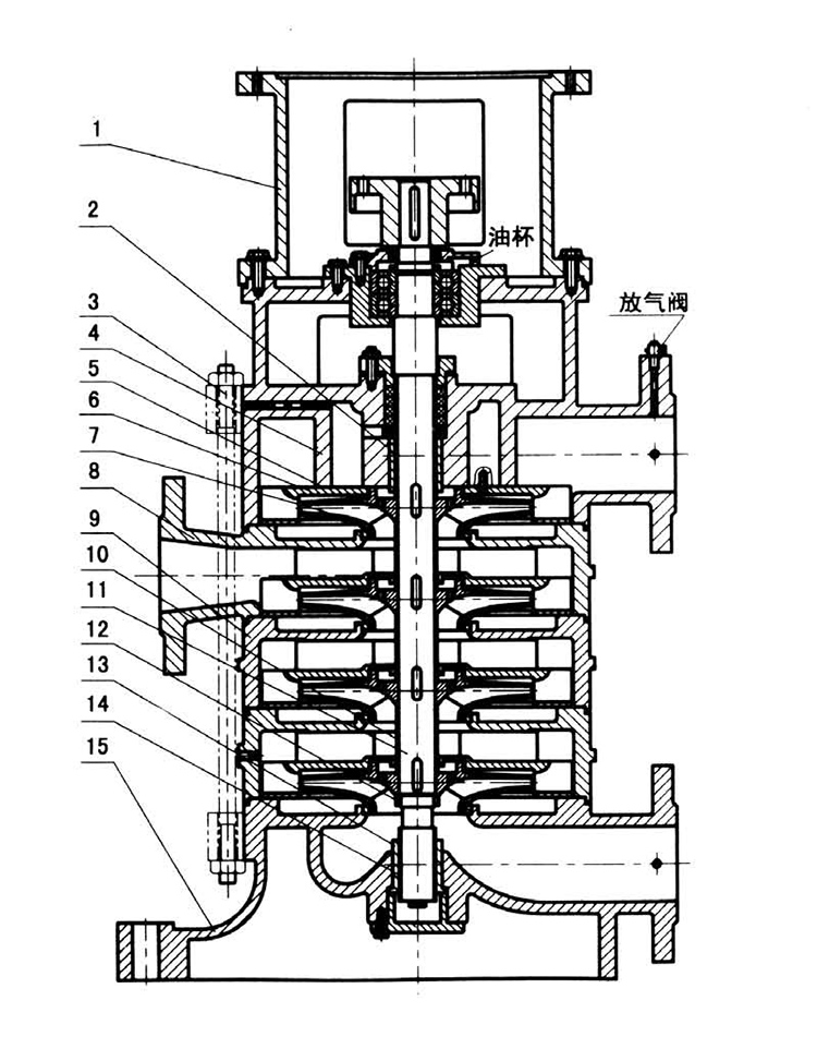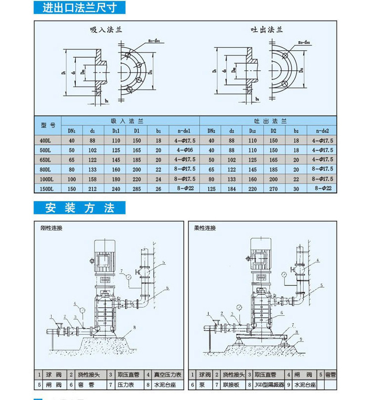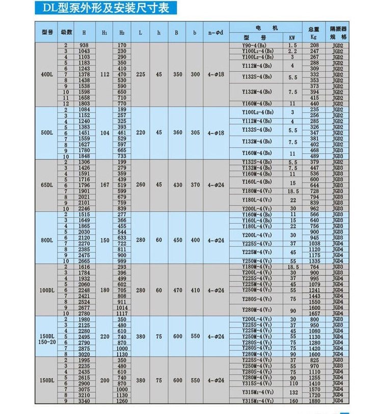 DL立式多級離心泵為立式多級多節段式結構。螺桿把進水段、中段、出水段夾緊聯成一體。水泵每一級 裝一個葉輪、一個導水葉。軸向力采用水力平衡法解決,殘余軸向力由球軸軸承承受,用油脂潤滑。軸封采用軟填料或機械密封。產品執行JB/T2727-93 《立式多級離心泵型式與基本參數》標準,主要供吸送稀釋的、清潔的、不腐蝕的、不爆炸的清水及物理化學性質類似水的不含固體顆粒或纖維的液體。